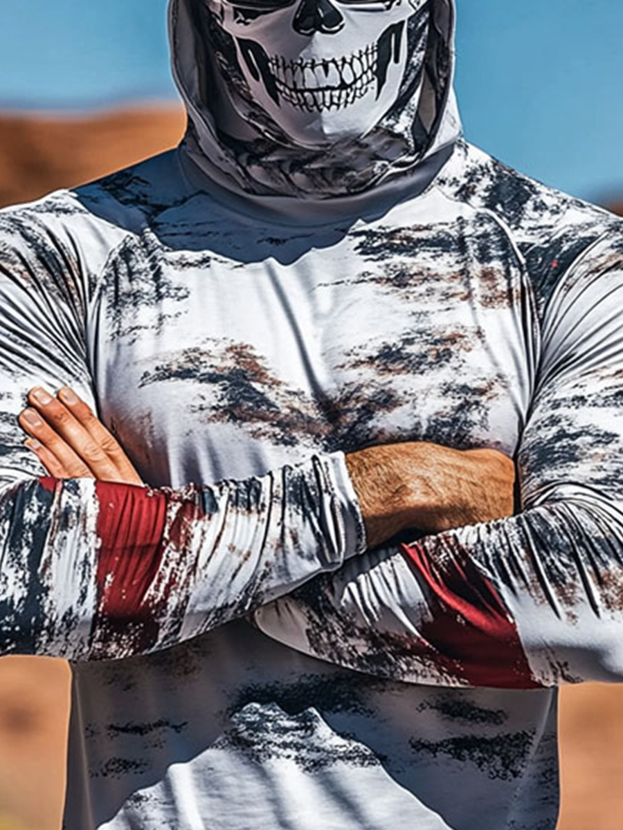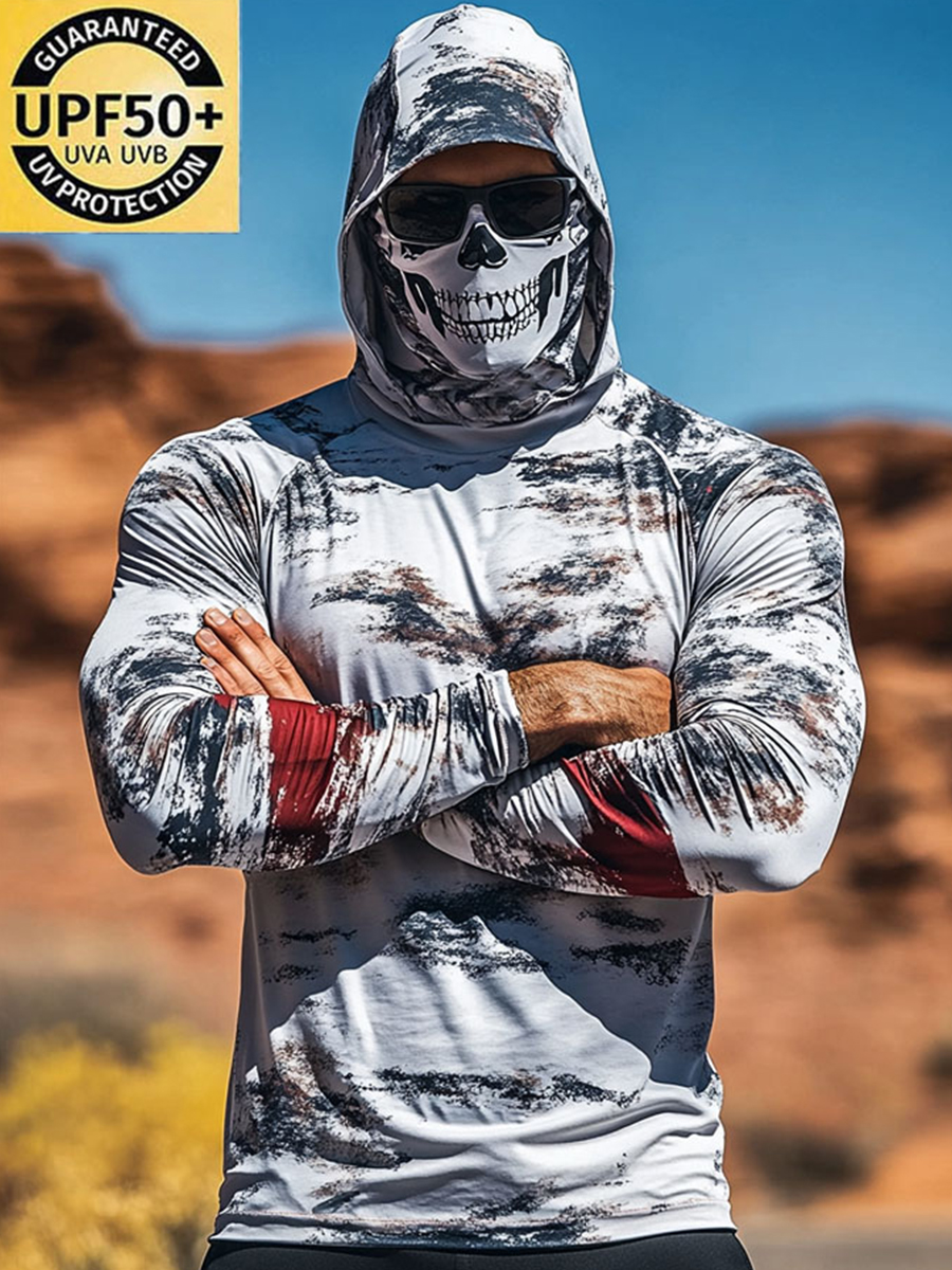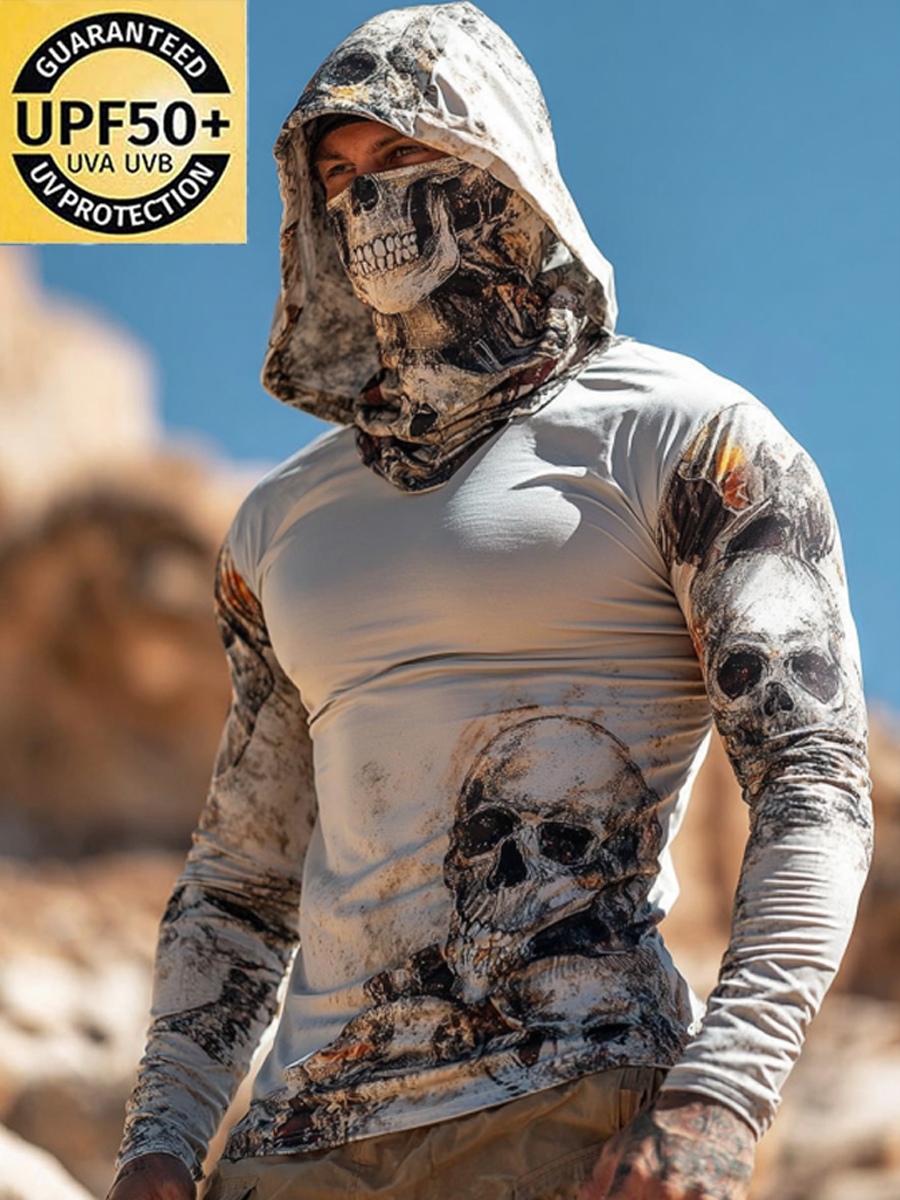 Men's Camouflage Sun Protection Hoodie, UPF50+ UV Protection, Built-in Face Mask, Skull Print, Quick-Drying and Breathable Outdoor Sun Protection Clothing