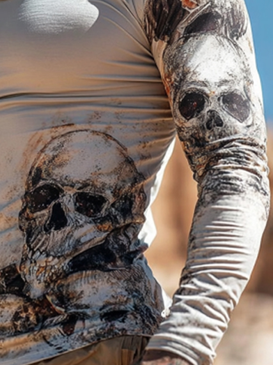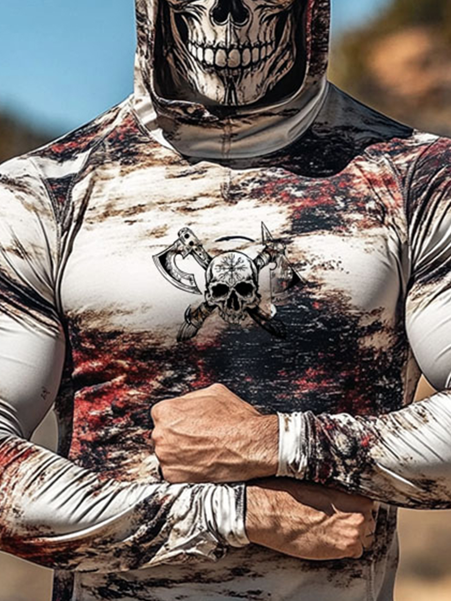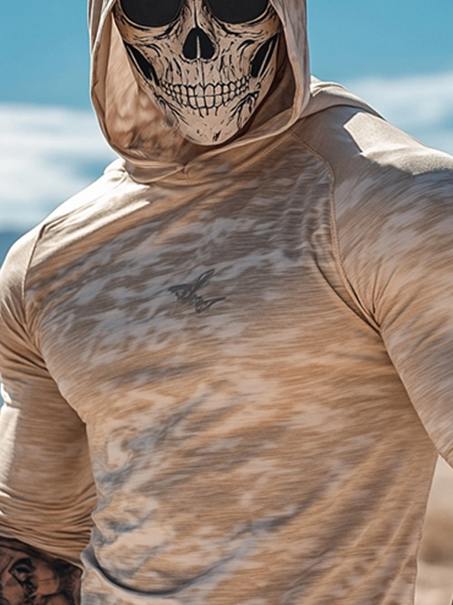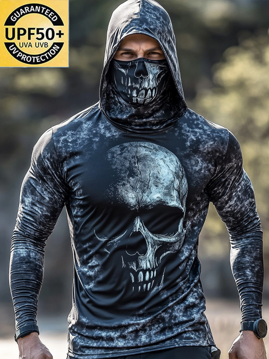Men's Camouflage Sun Protection Hoodie, UPF50+ UV Protection, Built-in Face Mask, Skull Print, Quick-Drying and Breathable Outdoor Sun Protection Clothing