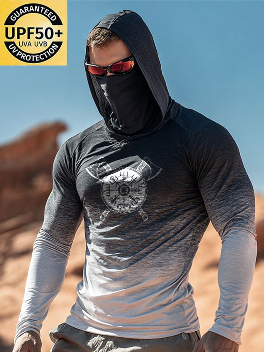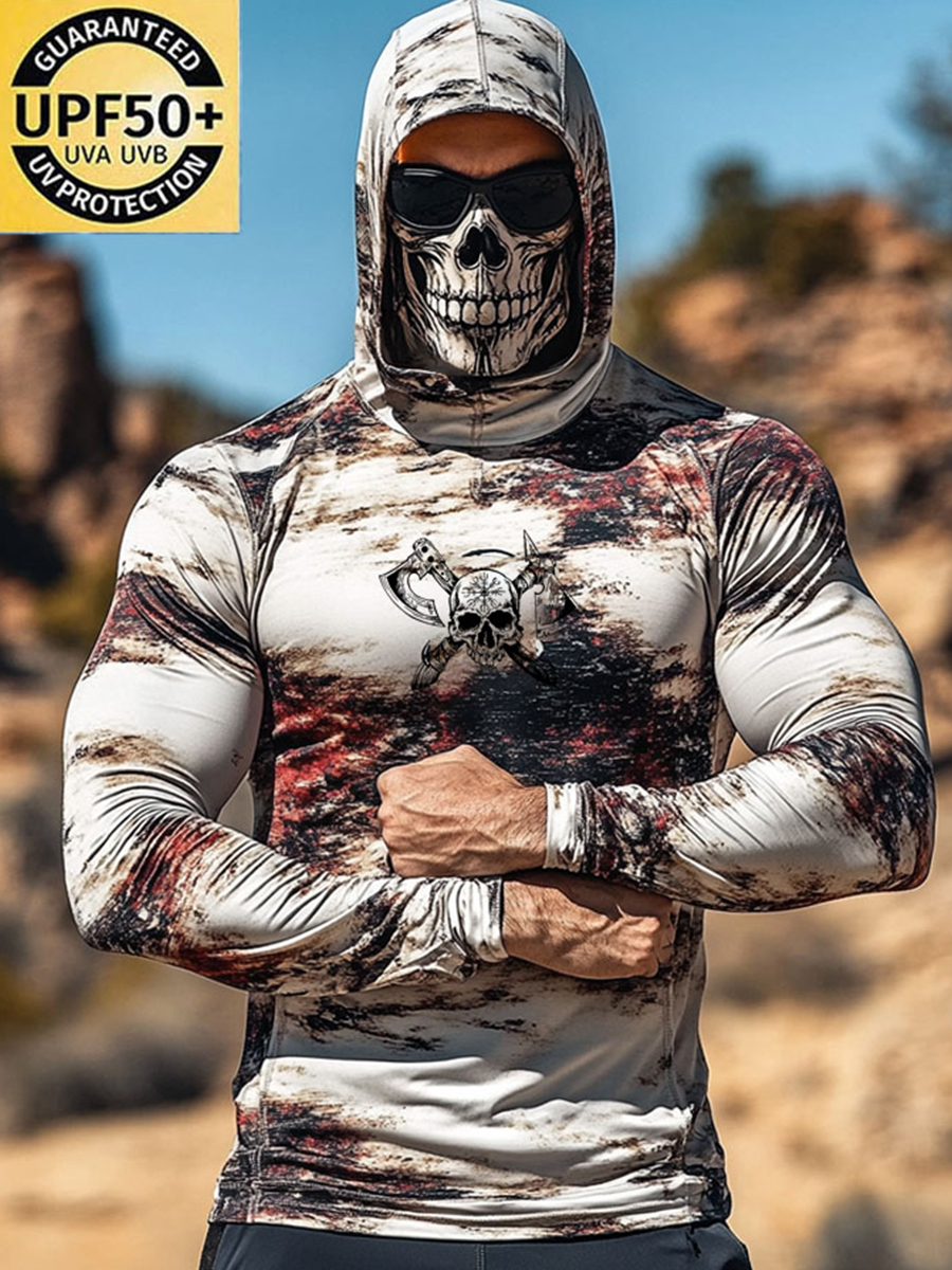 Men's UPF 50+ Hoodie With Built-In Mask - Skull Axe Graphic Print - Quick-Dry Performance Sun Protection Hoodie