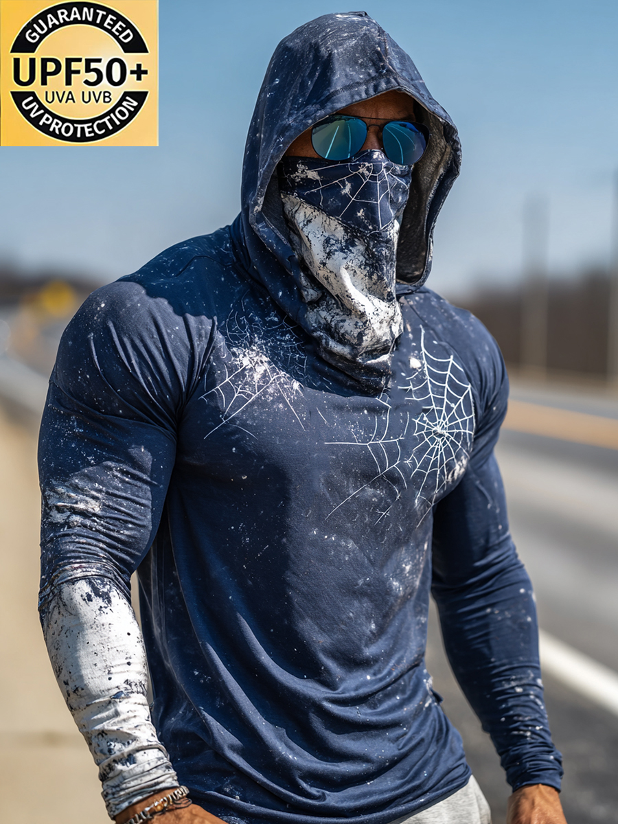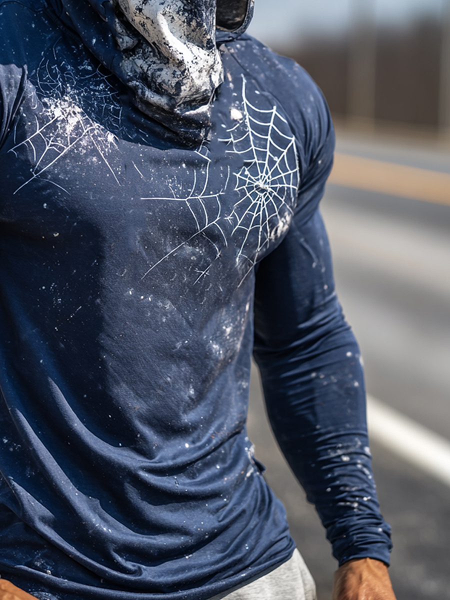 Men's Raglan Sleeve Finger Gloves Face Mask Spiderweb Splatter Washed Print Sun Protection Hoodie