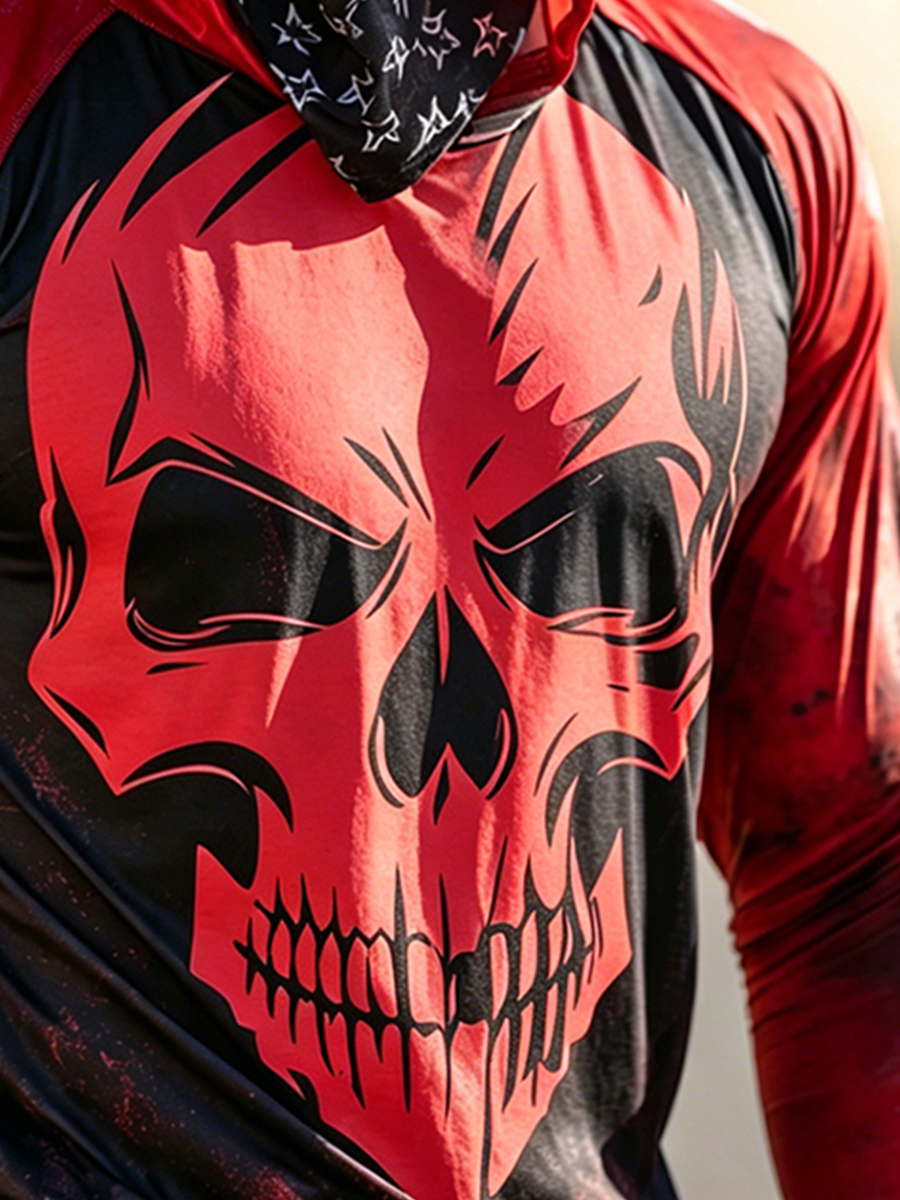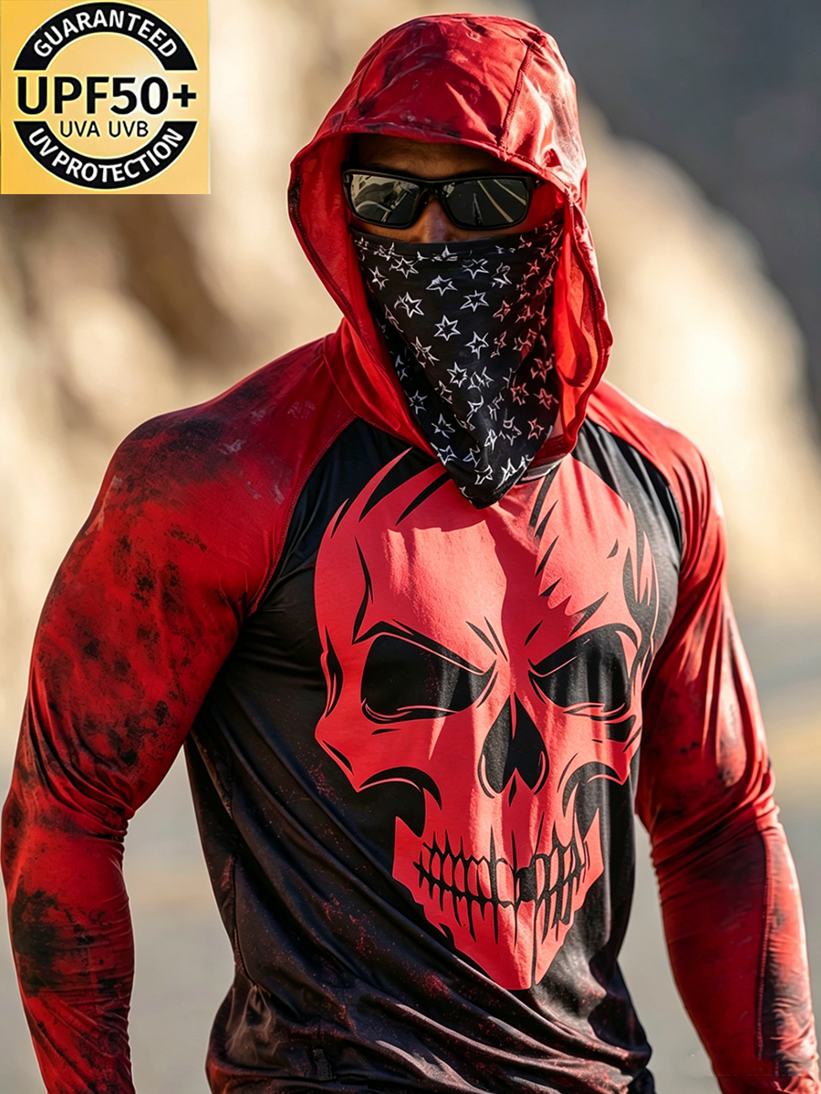 Men's Outdoor Sun Protection Breathable Cool Mask Red Black Splatter Skull Print Hooded Sun Protection Long Sleeve Top