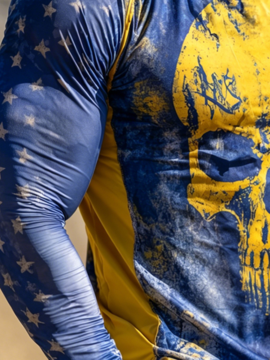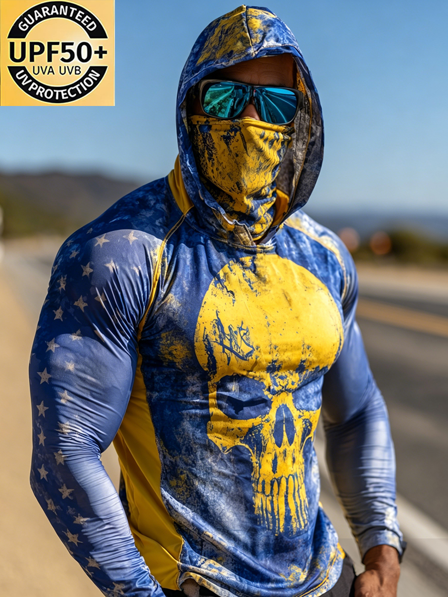 Men's Outdoor Sun Protection Breathable Cool Mask Blue Yellow Star Skull Print Hooded Sun Protection Long Sleeve Top