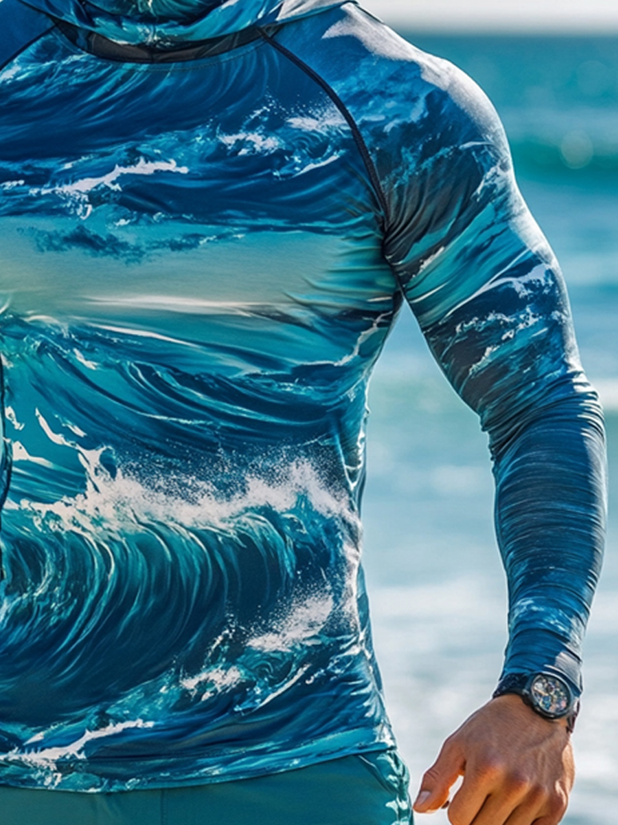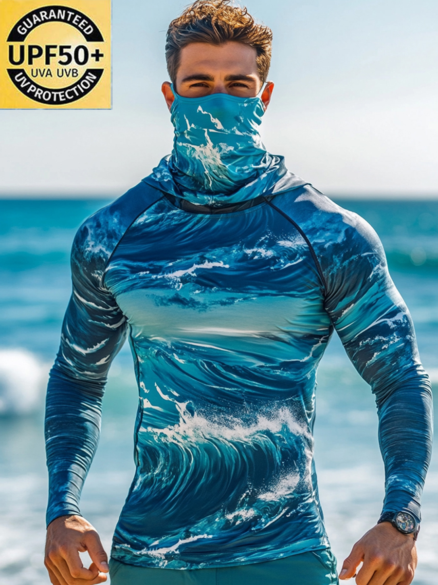 Men's Raglan Sleeve Finger Gloves Face Mask Sea Wave Print Sun Protection Hoodie