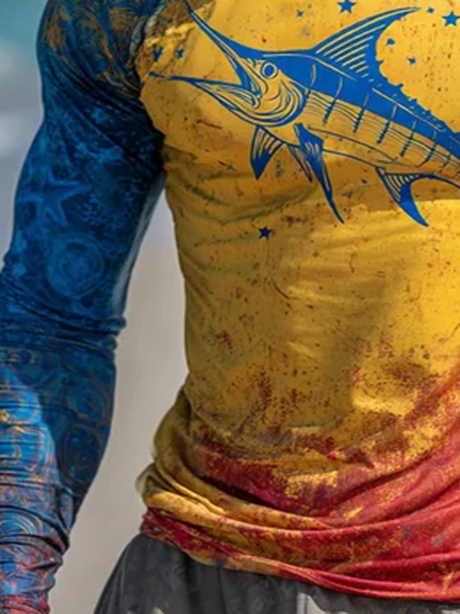 Men'S UPF 50+ Fishing Hoodie With Built-In Mask -Yellow And Blue Spliced Raglan Sleeve Sailfish- Quick-Dry Performance Sun Hoodie