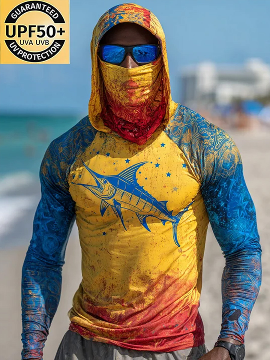 Men's Raglan Sleeve Finger Gloves Face Mask Swordfish Print Sun Protection Hoodie