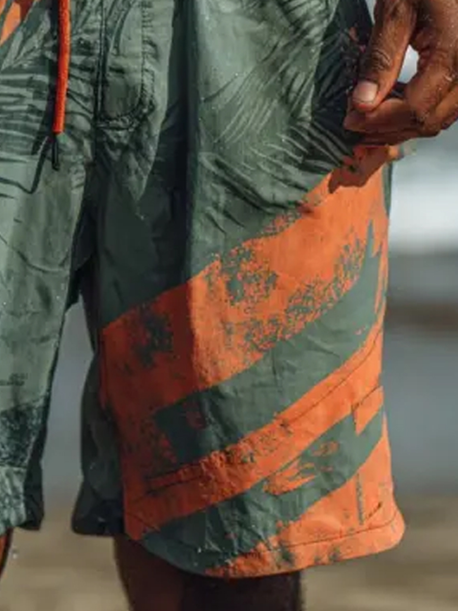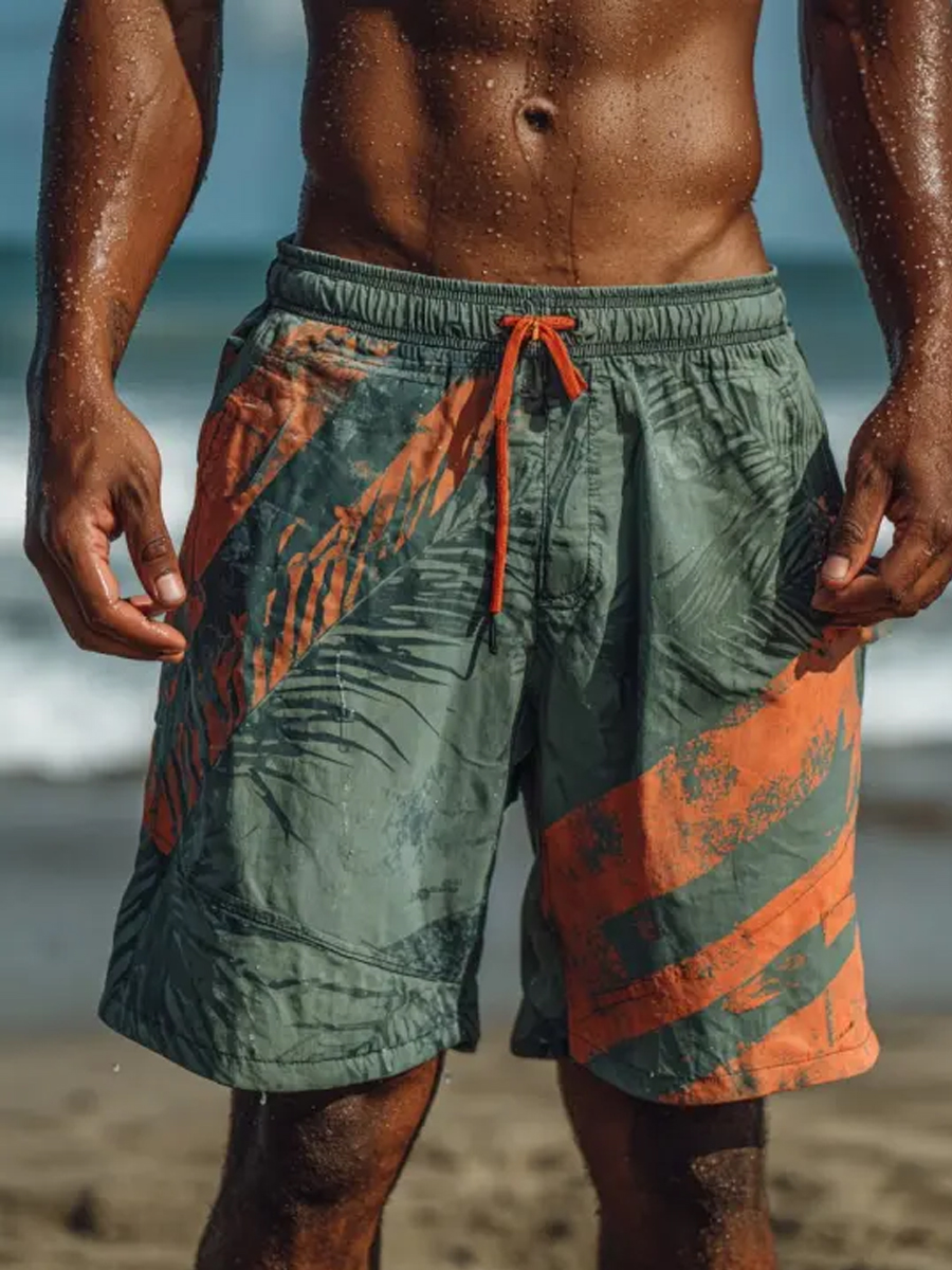 Men's Tropical Leaves Abstract Striped Print Beach Casual Quick-Drying Shorts
