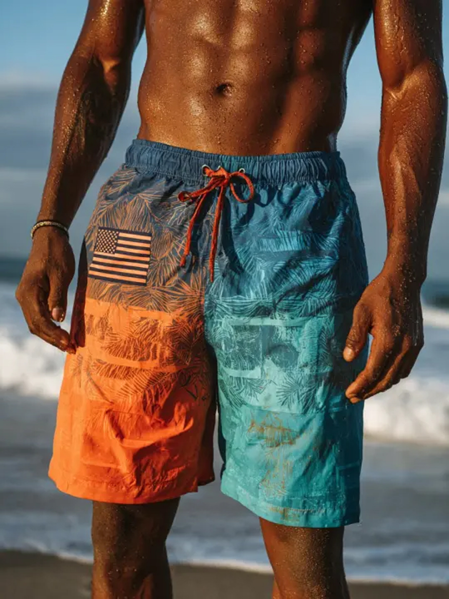 Men's Tropical Plants USA Flag Ombre Print Beach Casual Quick-Drying Shorts