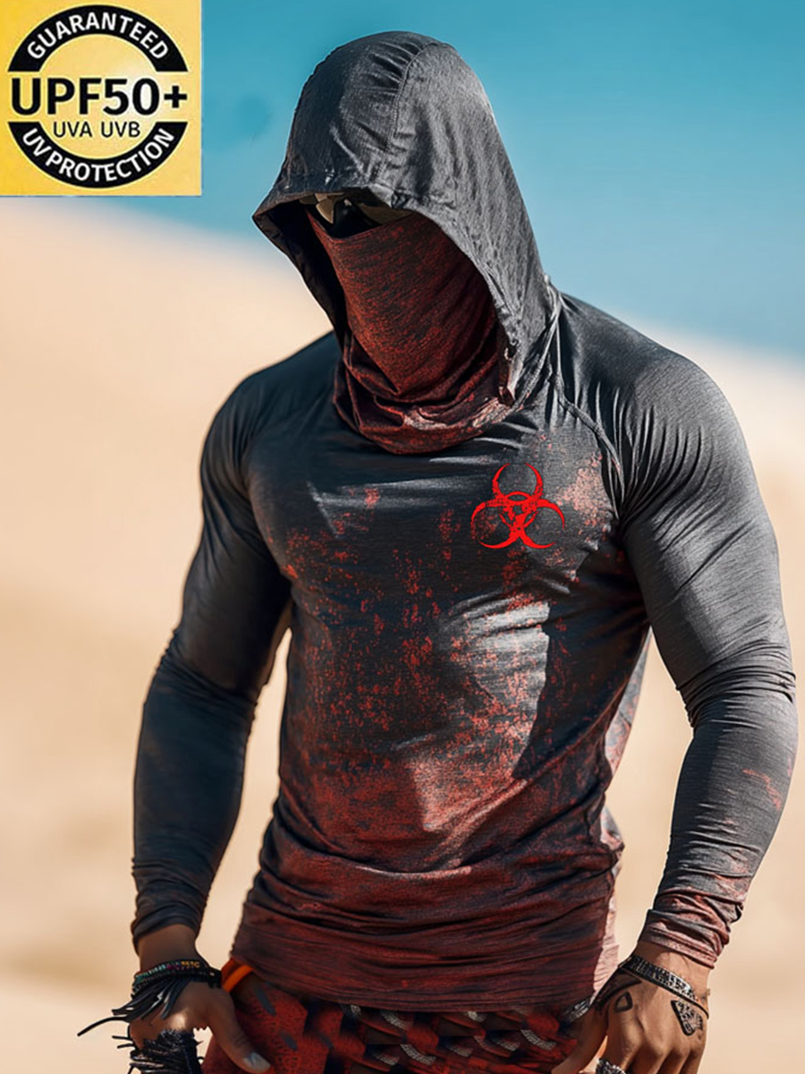 Men's UPF 50+ Sun Protection Hoodie with Built-in Face Mask - Splatter Gradient Red Biohazard Symbol Graphic Print - Quick-Drying High-Performance Sun Protection Hoodie