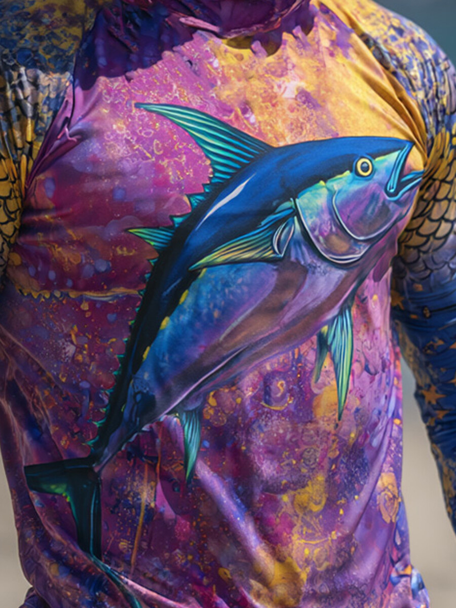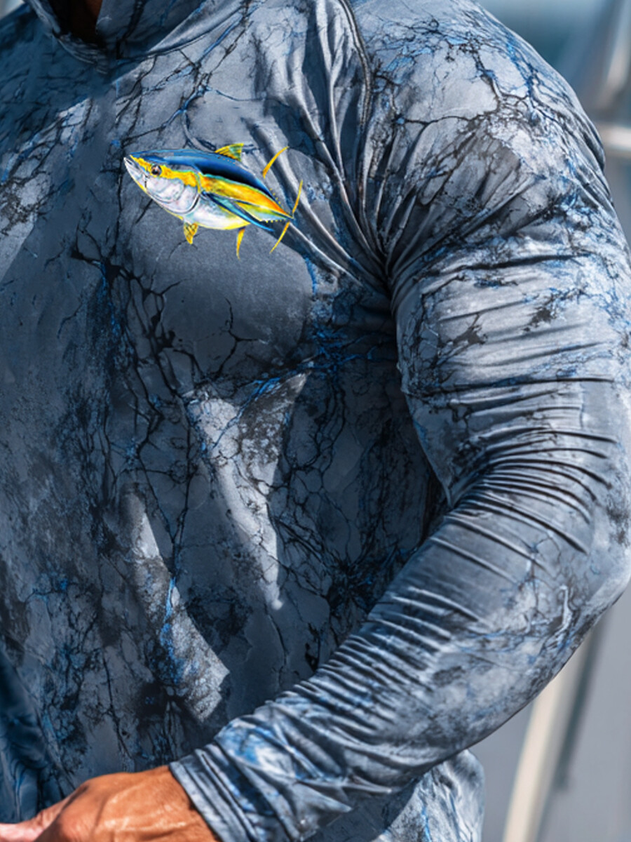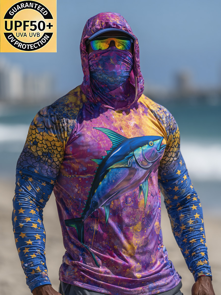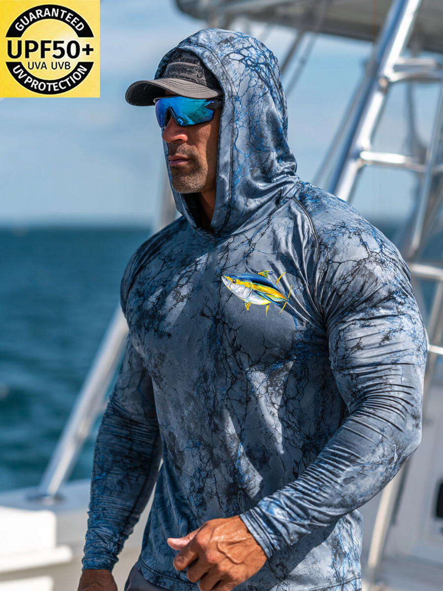 Men'S UPF 50+ Hoodie With Built-In Mask -Yellowfin tuna pattern- Quick-Dry Performance Sun Hoodie