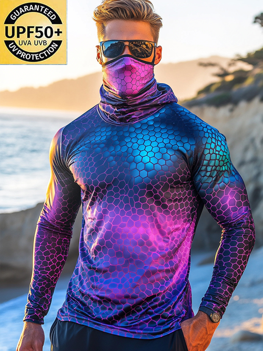 Men's Raglan Sleeve Finger Gloves Face Mask Neon Hexagon Print Sun Protection Hoodie
