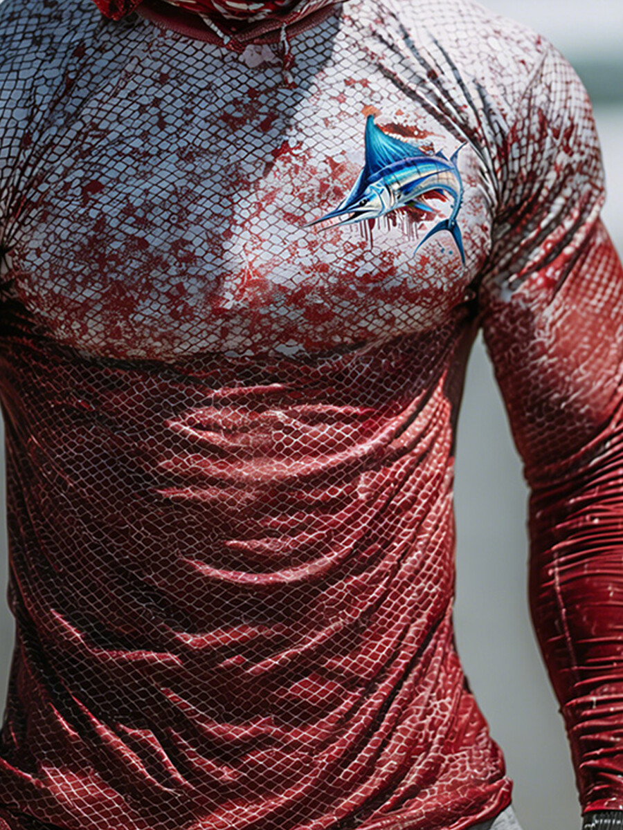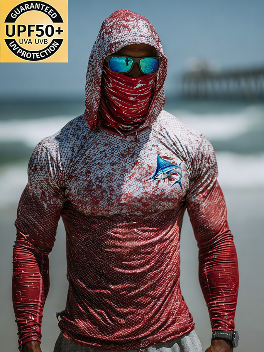 Men's Raglan Sleeve Finger Gloves Face Mask Blue Marlin Fish Grid Print Sun Protection Hoodie