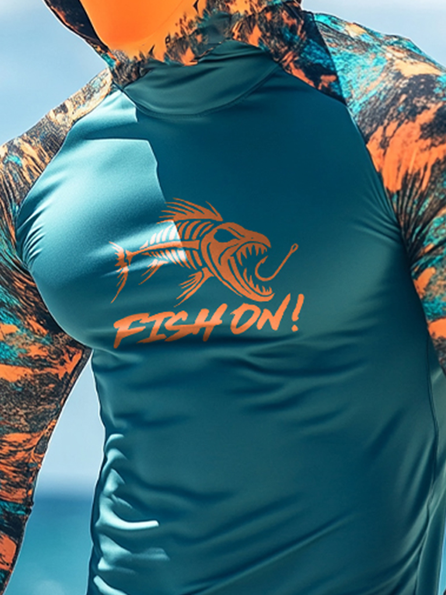 Men's Raglan Sleeve Finger Gloves Face Mask Fish Skeleton FISH ON Camo Print Sun Protection Hoodie
