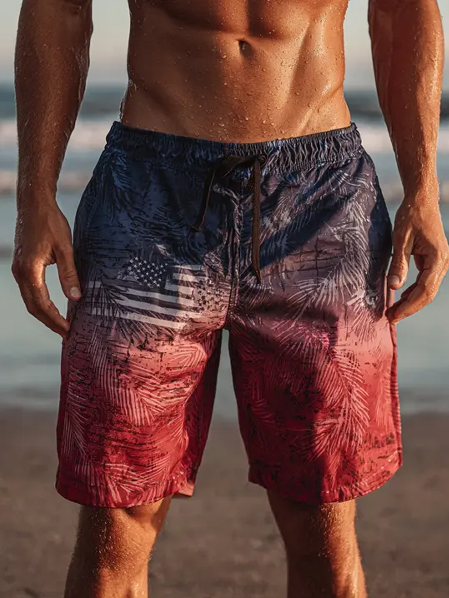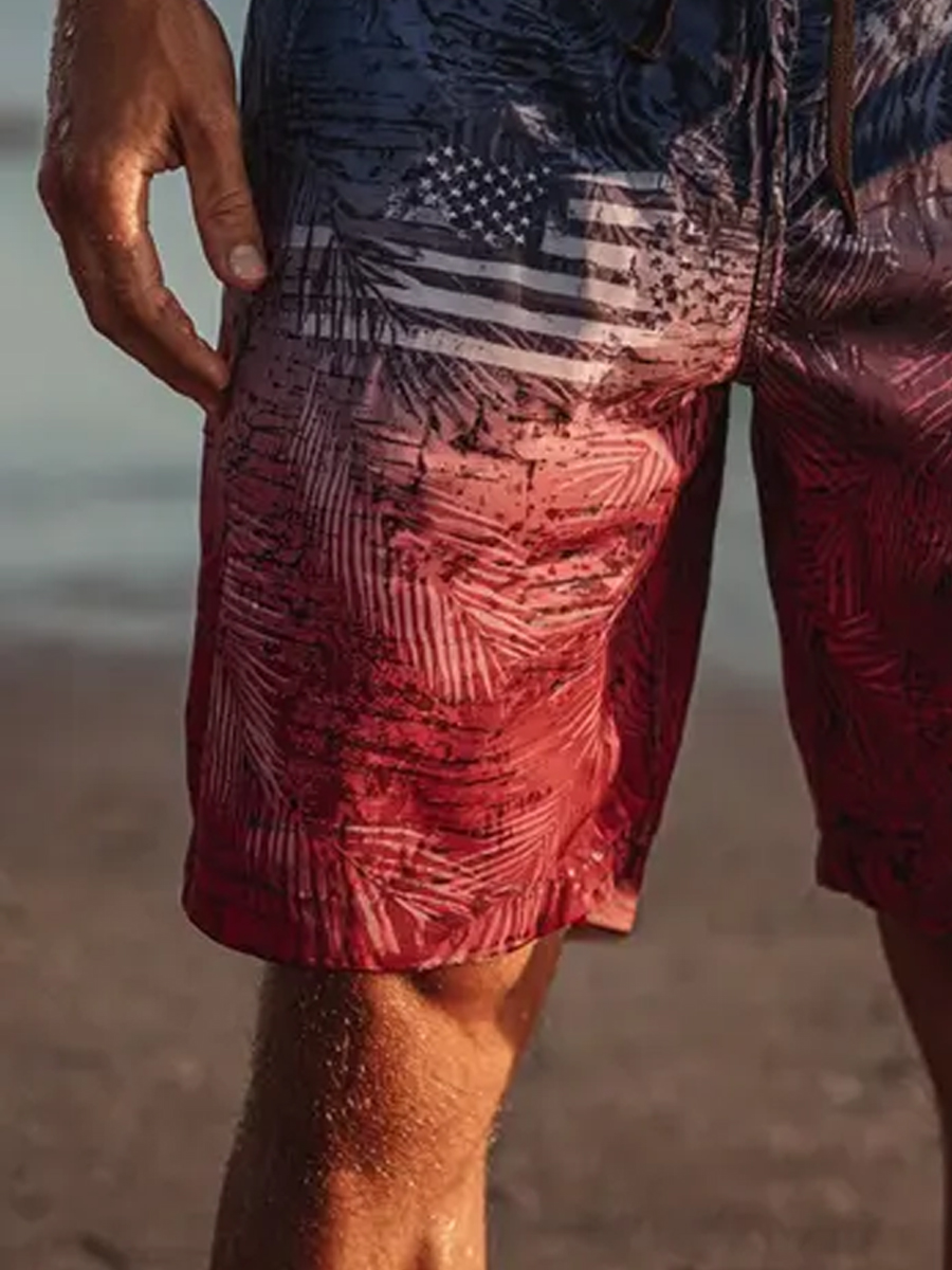 Men's Tropical Plants USA Flag Ombre Print Beach Casual Quick-Drying Shorts