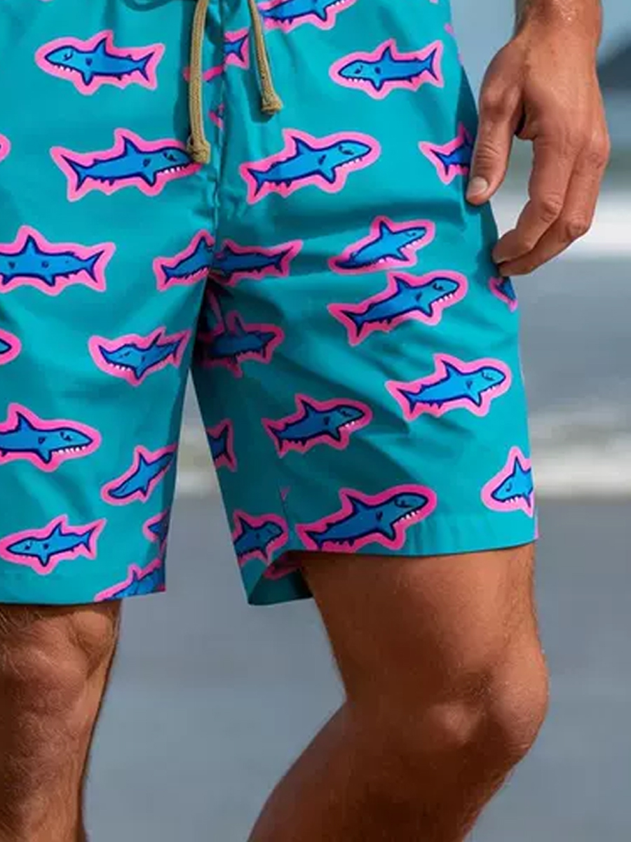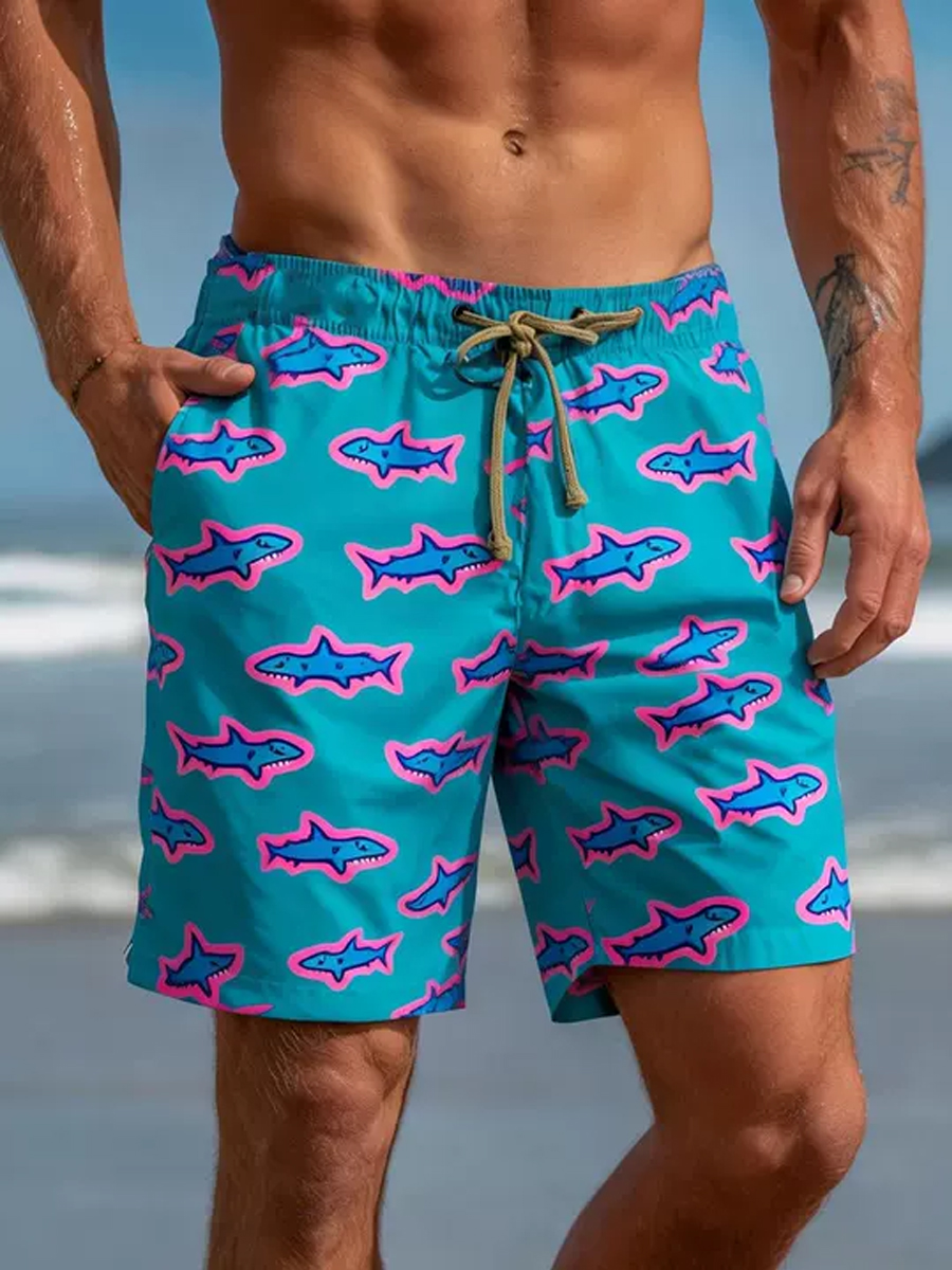 Men's Cartoon Shark Graphic Print Beach Casual Quick-Drying Shorts