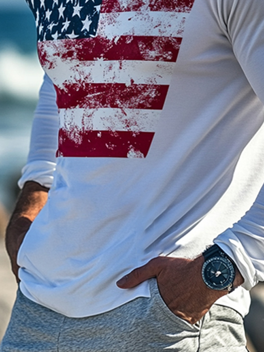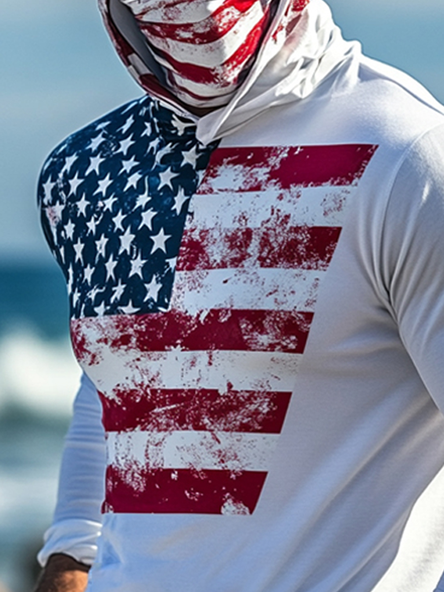 Men's Raglan Sleeve Finger Gloves Face Mask White Base Patriotic Flag Print Sun Protection Hoodie