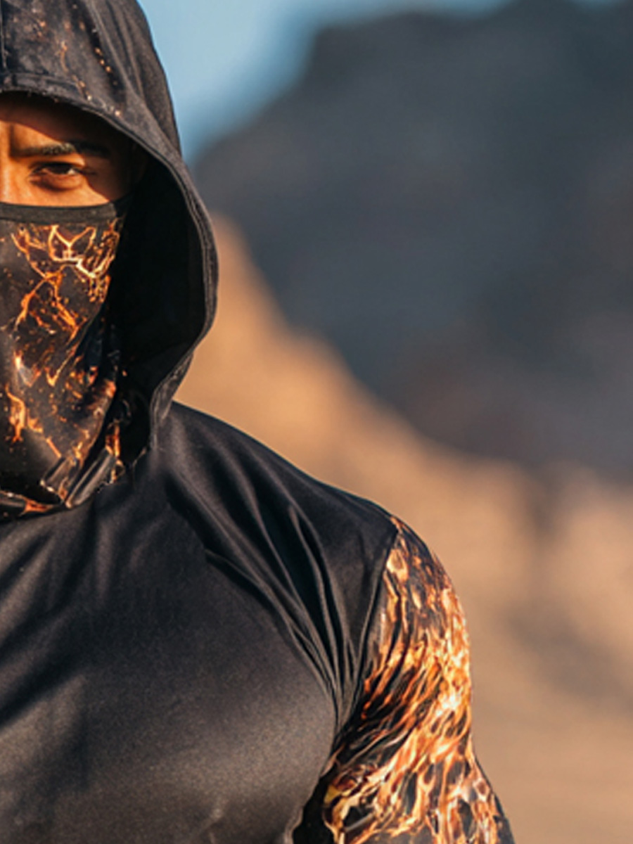 Men'S UPF 50+ Fishing Hoodie With Built-In Mask -Motorcycle Lava Flame Pattern- Quick-Dry Performance Sun Hoodie