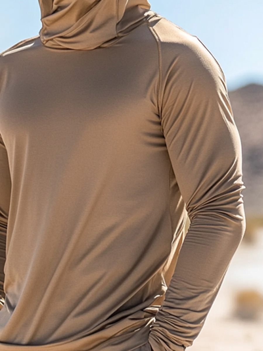 Men's UPF 50+ Sun Protection Hoodie with Built-in Face Mask - Solid Khaki Stretch Fitted - Quick-Drying High-Performance Sun Protection Hoodie