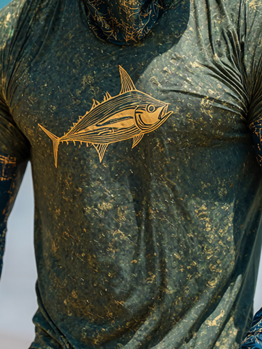 Men's Raglan Sleeve Finger Gloves Face Mask Fish Graphic Print Sun Protection Hoodie