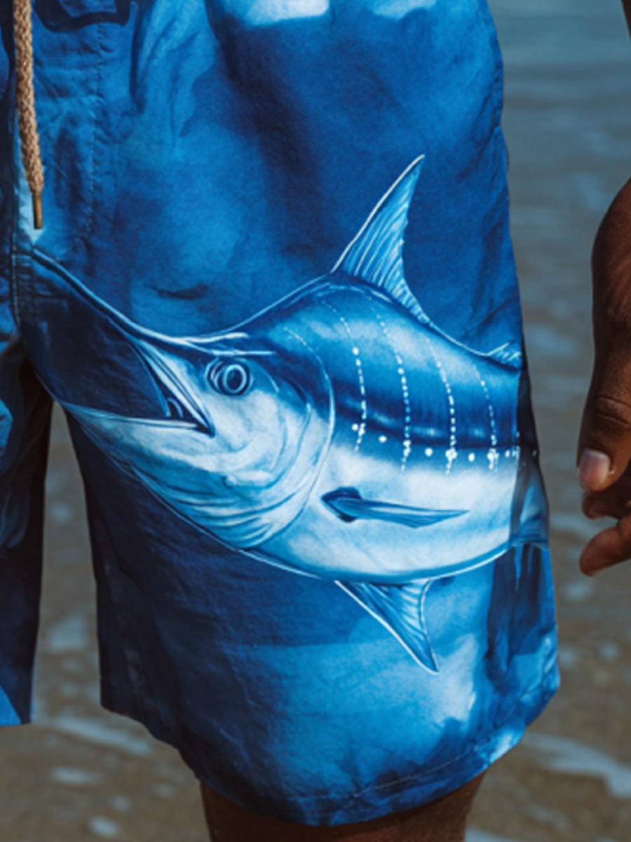 Men's Single Side Large Marlin Fish Print Beach Casual Quick-Drying Shorts